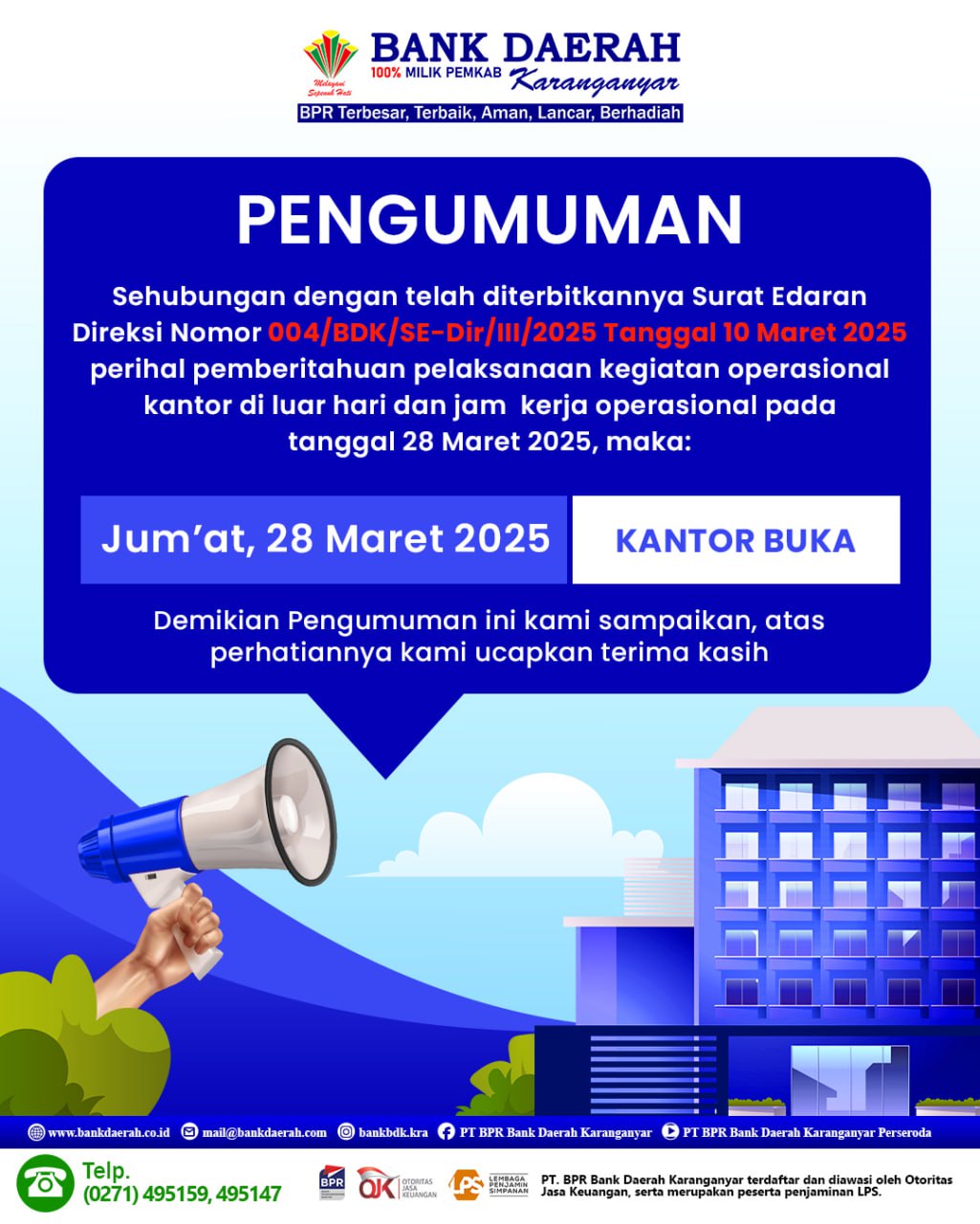 Pengumuman hari kerja operasional:![]() Klik untuk memperbesar | Pengumuman hari kerja operasional : Sehubungan dengan telah diterbitkannya surat edaran nomor 004/BDK/SE-Dir/III/2025 tanggal 10 Maret 2025 perihal pemberitahuan pelaksanaan kegiatan operasional kantor di luar hari dan jam kerja operasional pada tanggal Demikian pengumuman ini kami sampaikan, atas perhatiannya kami ucapkan terima kasih. PT. BPR Bank Daerah Karanganyar (Perseroda) | 10 Maret 2025 |